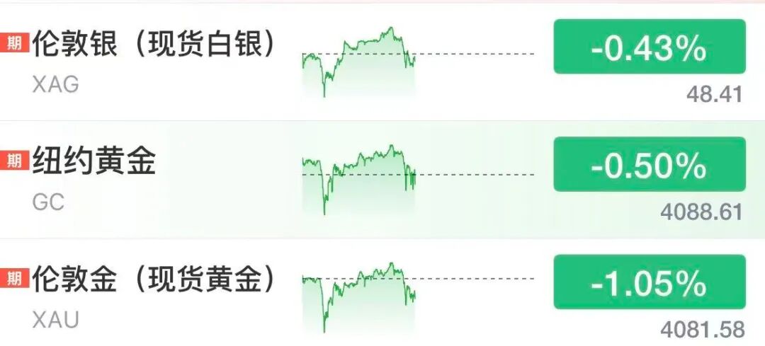 今天截至17时,现货黄金报4081.23美元/盎司,跌幅逾1%,现货白银报48.39美元/盎司,跌0.47%。