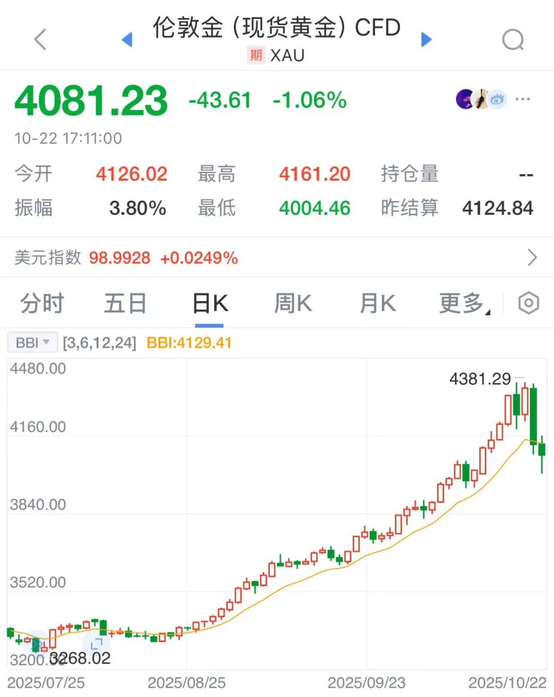 每日商报讯 北京时间10月22日,现货黄金亚市早盘大幅波动,盘中一度险守4000美元大关,跌幅超2%,随后围绕4100美元一线反复震荡。