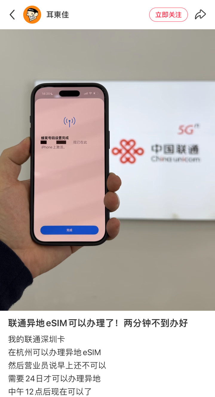 在社交平台上,博主@耳東佳分享了联通eSIM异地办理的新进展:其持有的联通深圳号码,已成功在杭州的联通营业厅完成异地eSIM办理,全程耗时不到两分钟,手机页面也显示“蜂窝号码设置完成”的激活成功提示。该用户还透露,当天上午营业厅工作人员曾表示异地eSIM业务需10月24日才开放,但在中午12点后已可正常办理,这意味着联通异地eSIM服务已提前在部分营业厅落地,为跨地区用户提供了更便捷的办理流程。
