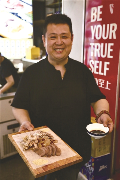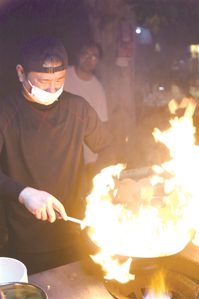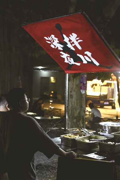 晚上九点半,往化工研究院的大院里走,“很臭美”门口小摊前已经排上队了。摊主戴着黑色口罩,在直播镜头前挥铲如飞,这就是大半年来很火的深夜拌川。