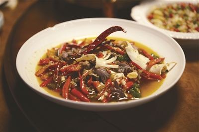 上世纪90年代,大川来到杭州做川菜,多年后看到老朋友,他一高兴就进厨房给我们做了几个菜,此时我注意到他的菜变“融合”了。川菜版的倒立蟹,是将梭子蟹对半切开后,倒立于铺满芝麻的香辣调料中,梭子蟹肉与芝麻结合,颊齿留香。还有哦,大川自己做的泡菜深埋在调料里,泡萝卜也沾上了蟹味。