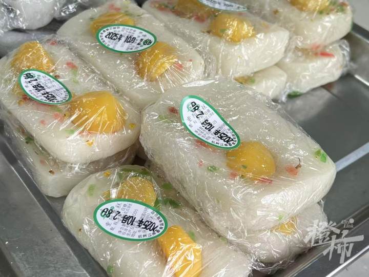 旁边买糕的大伯说:“知道明天肯定要排队,今天特意提前来买,多买几块回去和家人分一分。”