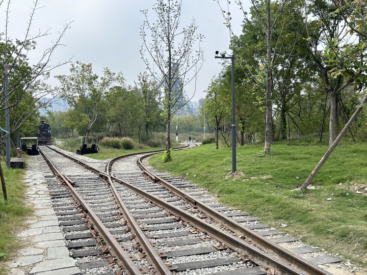 坐在木质的座椅上,“铛铛”几声铃响后,车子就慢慢启动了。行驶在铁轨上,微微晃动,车窗两边杭钢公园的美景尽收眼底。到了铁轨交汇的地方,提前就有道闸落下,提示周围的行人停步等待。