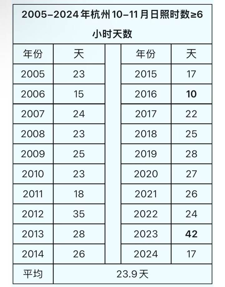 按照这个自定义的标准来看,从2005年-2024年杭州10月-11月(总计61天)日照时数≥6小时天数来看,平均天数达到了23.9天,占比39.2%,因此秋高气爽的天气在10月-11月中的比例并不小。