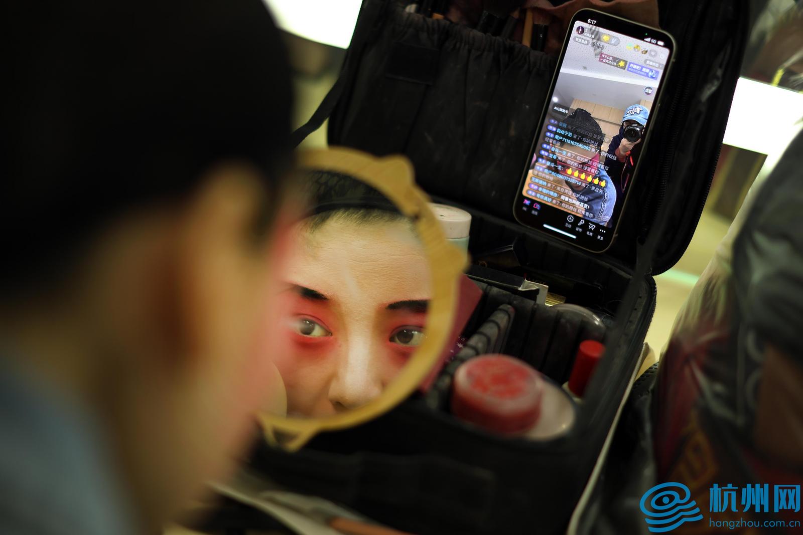 边化妆边直播的年轻演员。