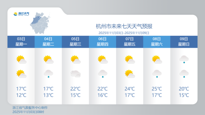 另外,与上周相比,本周雨水更为频繁,杭州预计将出现三次降雨过程,分别在明天到后天、6日以及周末。但由于水汽供应并不充沛,这三次降雨均以弱降水为主,对出行影响有限。