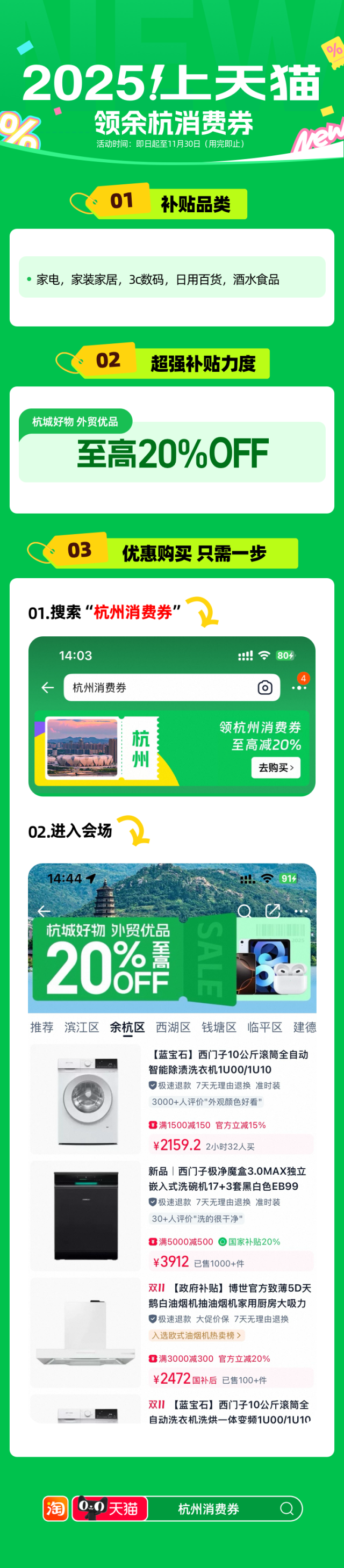 1.本轮活动为余杭区第三轮消费券发放活动,非国家消费品以旧换新补贴活动,不可重叠享受。