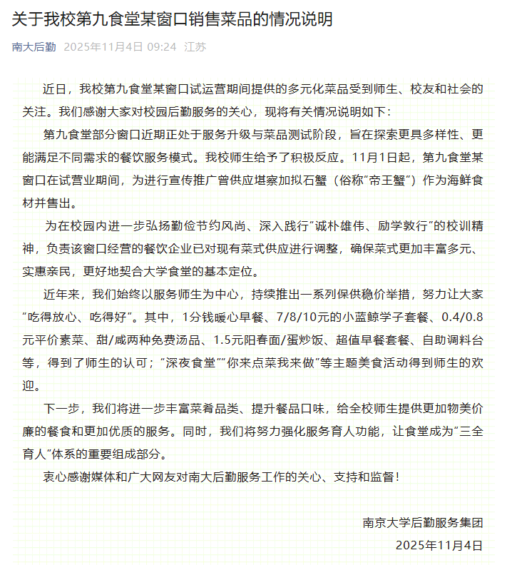 南京大学针对食堂售卖帝王蟹发布情况说明