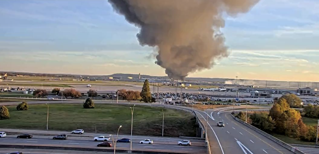 美国肯塔基州一机场发生飞机坠毁事故,现场浓烟滚滚