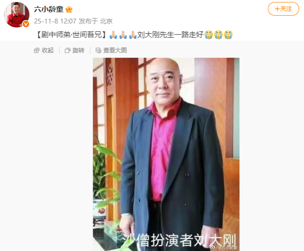 11月7日,戏曲演员刘冰今天下午通过微博透露,著名表演艺术家、《西游记续集》沙僧的扮演者刘大刚于2025年11月3日在京病逝,享年78岁。