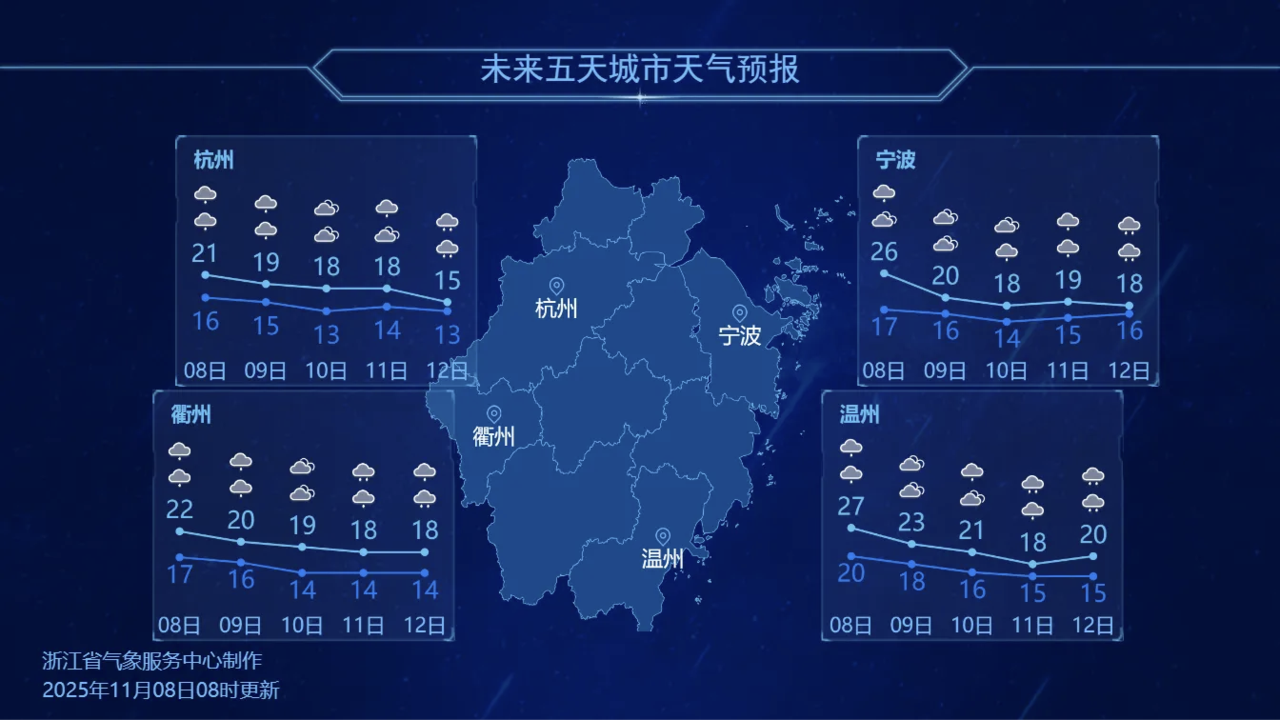 浙江部分城市天气预报。图源:浙江天气