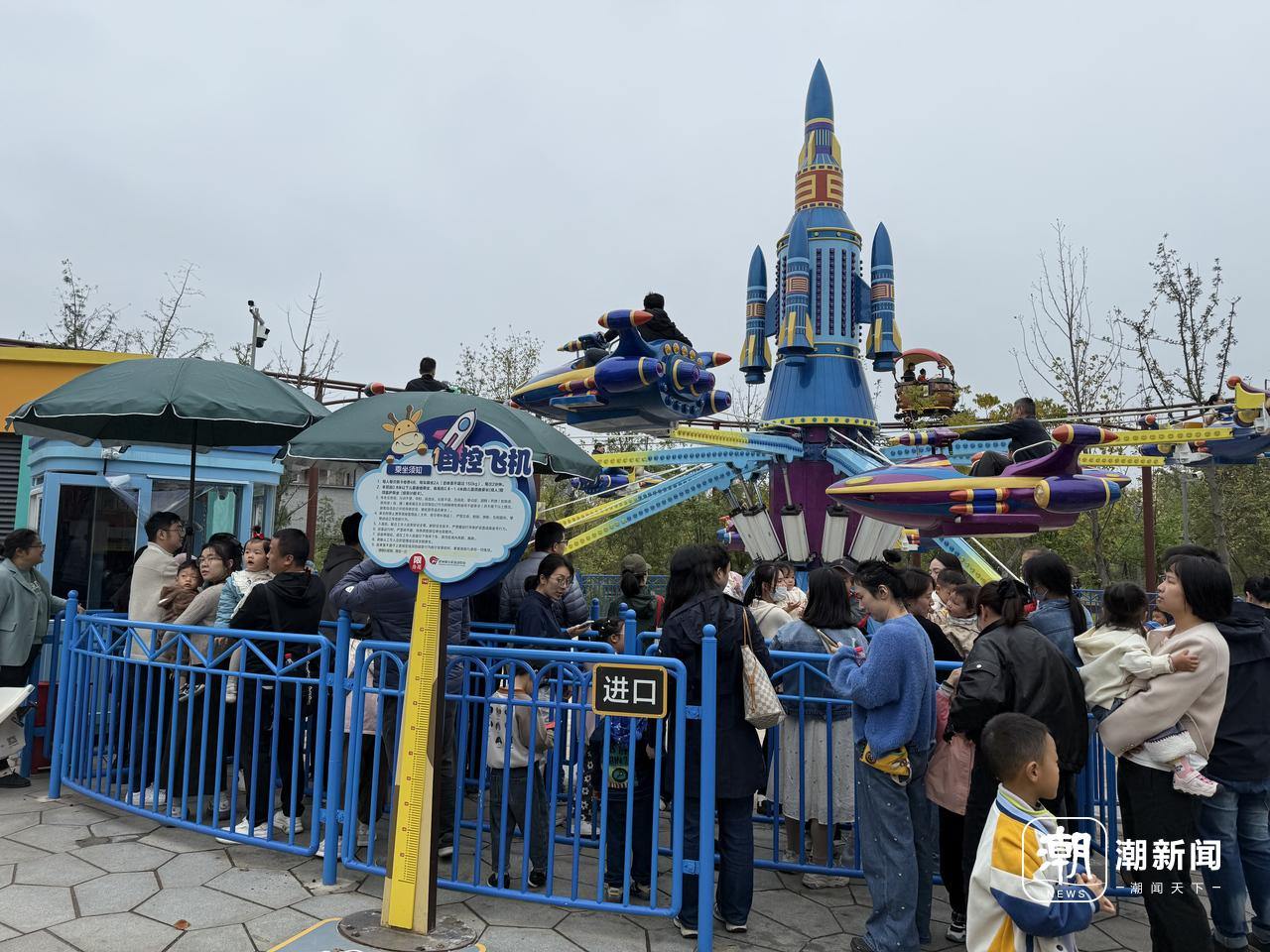 上午9点,记者走进游乐园,多巴胺配色的游乐设施一下子撞进视野。旋转木马、海盗船、自控飞机等经典项目依次排开,不少项目前已经排起了队伍。穿雨披的小朋友踮脚盯着队伍,嘴里念叨“快到我们了”。最热门的“太空漫步”项目前,队伍已排出了50多米。