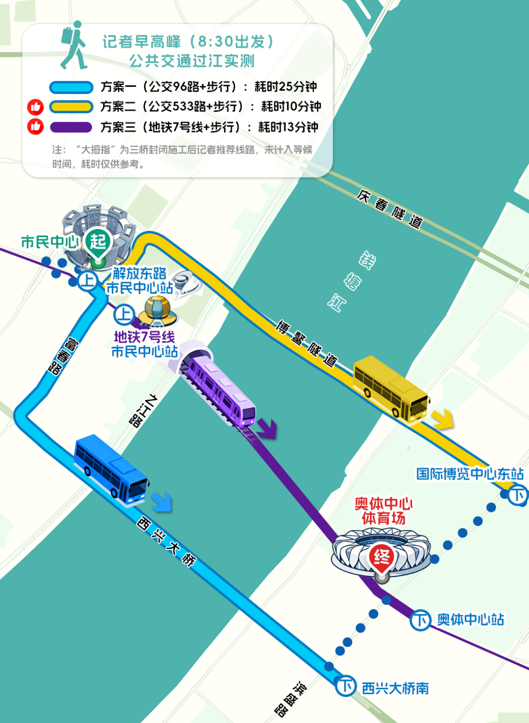 其中,望江隧道和复兴大桥两条路线的出行推荐指数较高。在早高峰8时30分许出发,两条线路分别耗时31分钟、35分钟,全程几乎没有拥堵点。