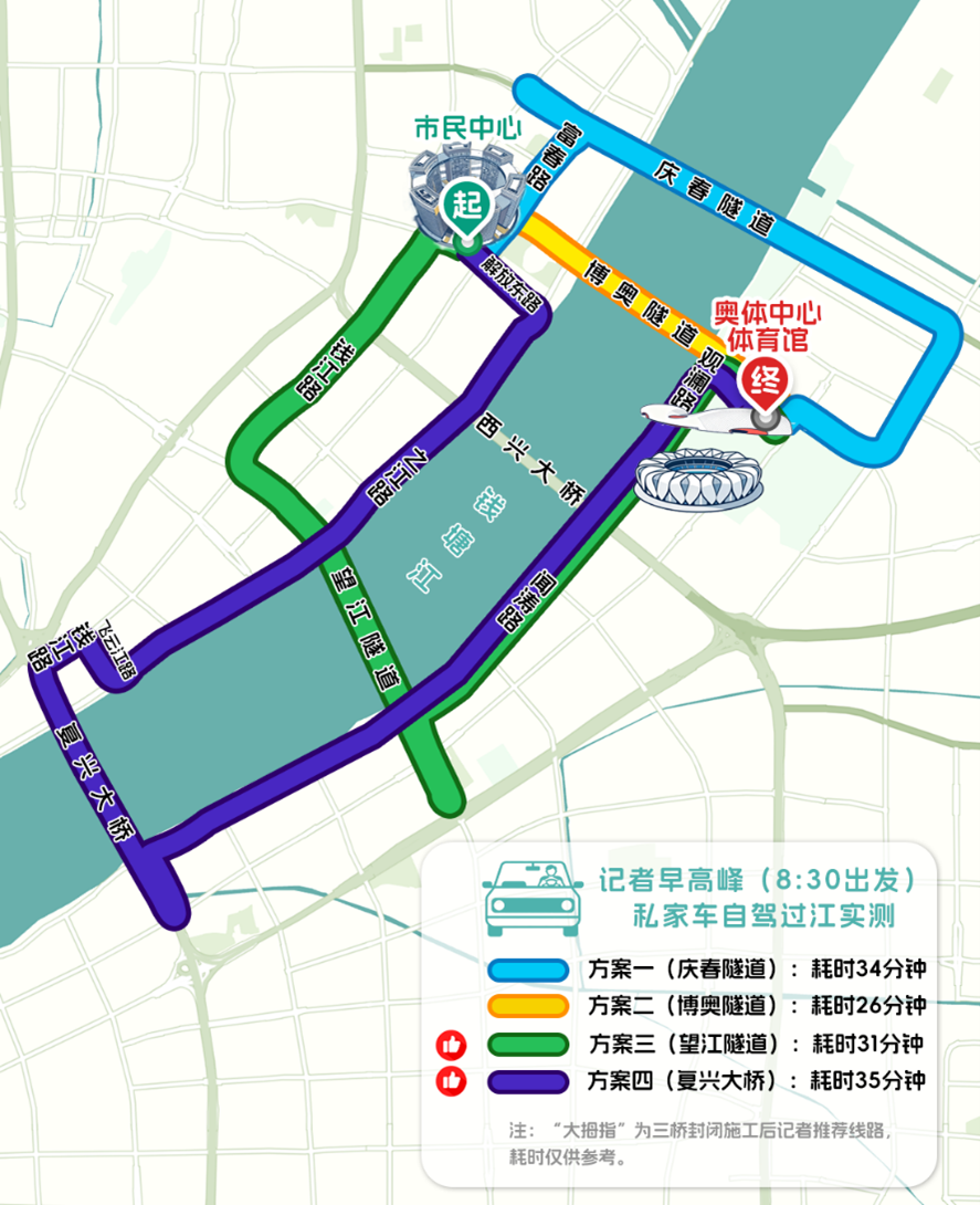 开车出行的你,共有“一桥三隧”四种替代路线,分别是通过复兴大桥、博奥隧道、庆春隧道、望江隧道代替钱江三桥跨江。我们按照测试拥堵指数、距离等因素,分别替大家提前探了探路。