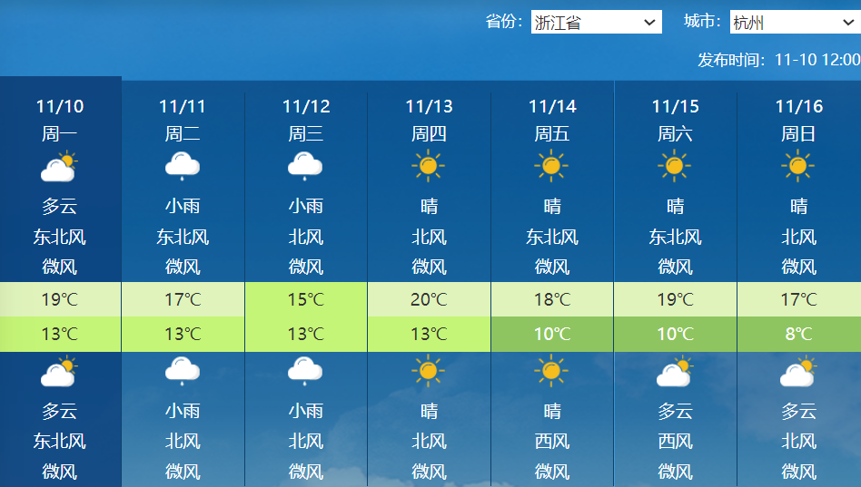 13日下午开始,杭州一直晴天,太阳管够,一直到11月下旬为止!