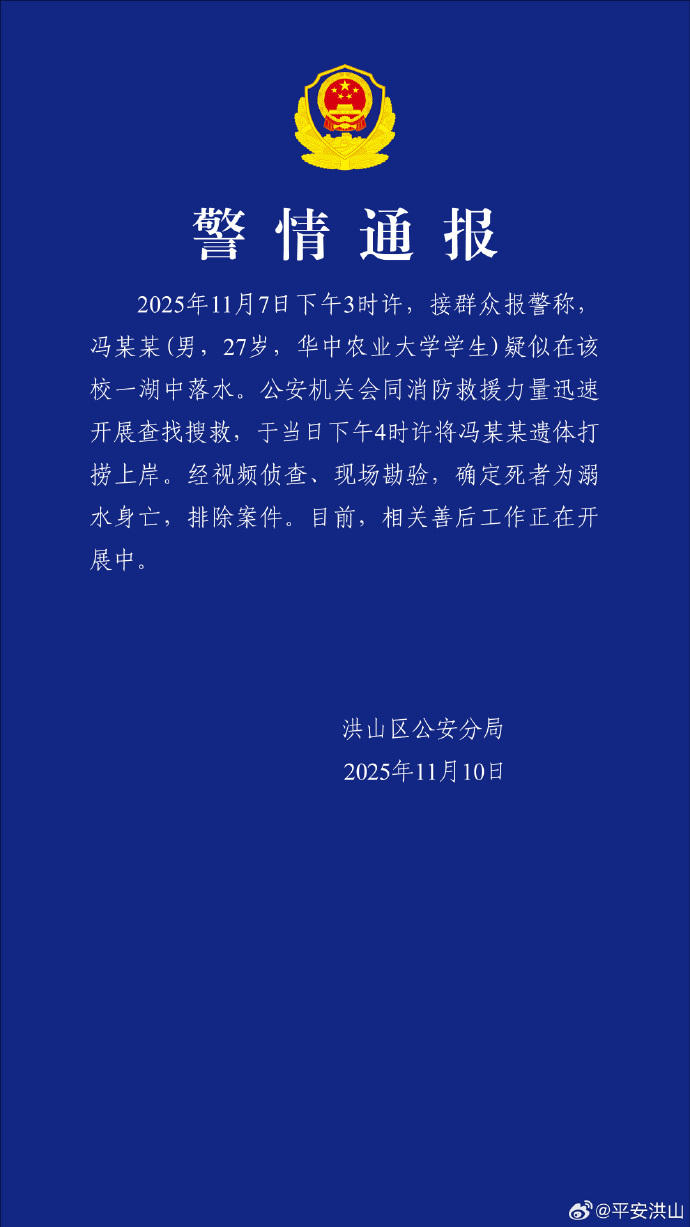 央视网消息:武汉市洪山区公安分局11月10日通报,11月7日下午3时许,接群众报警称,冯某某(男,27岁,华中农业大学学生)疑似在该校一湖中落水。公安机关会同消防救援力量迅速开展查找搜救,于当日下午4时许将冯某某遗体打捞上岸。经视频侦查、现场勘验,确定死者为溺水身亡,排除案件。目前,相关善后工作正在开展中。