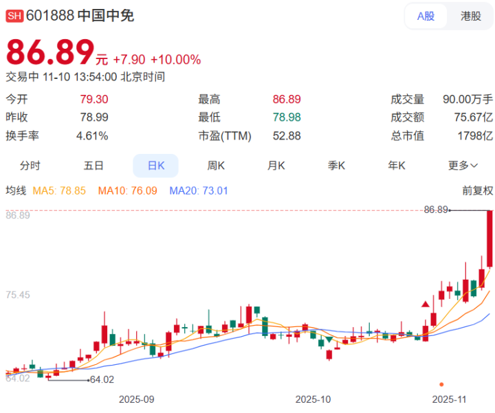 都市快报讯 11月10日,A股消费股出现了久违的上涨行情,其中免税龙头中国中免强势涨停,最新价报86.89元/股。