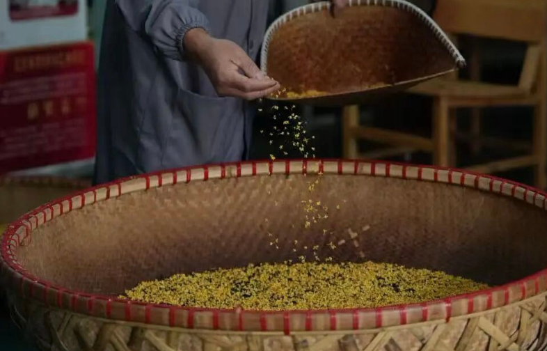 采摘下的鲜桂花经过筛花、醒花之后,为了让桂花尽可能地释放香气,他采用了更为天然的窨制工艺。和石灰窨制法不同,把一层茶叶和一层花交替铺成堆放在茶篓里,顶层以茶叶覆盖,“茶叶和桂花铺好后,会自然发酵散热,要用手去感应是否发烫,如果温度高了就要通花散热,”楼龙肖说,这一步他不放心给别人做,经常自己在工作间里一盯就是一整晚。几个小时就要通风一次,让桂花充分接触空气散热,延长桂花枯萎的时间。期间要根据茶叶和桂花之间的温度、湿度及时作出调整,一直到桂花的香气被茶叶完全吸收。