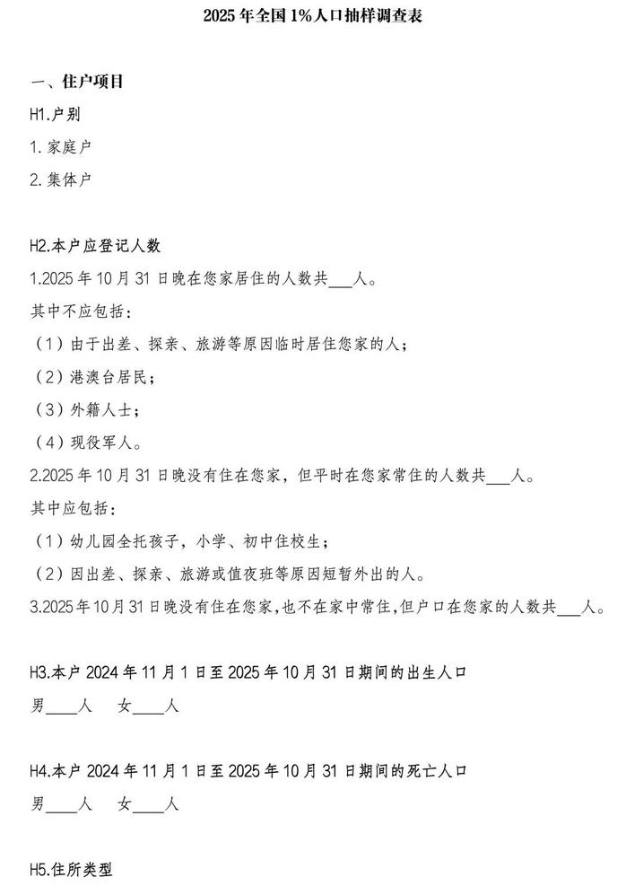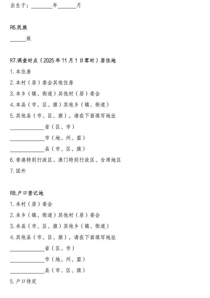 以“住户”为单位,2025年10月31日晚住在本户的人、常居本户临时外出的人、初中/小学/幼儿园住校生,以及户口在本地址的人都要登记;现役军人、外籍人员、临时暂住者除外。