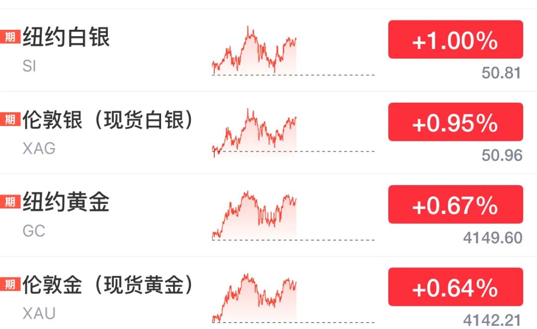 截至11日晚发稿,金价、银价双双上涨,现货黄金盘中突破4140美元/盎司,报4142.43美元/盎司,涨幅0.65%;现货白银突破50美元/盎司,报50.81美元/盎司,涨1%。