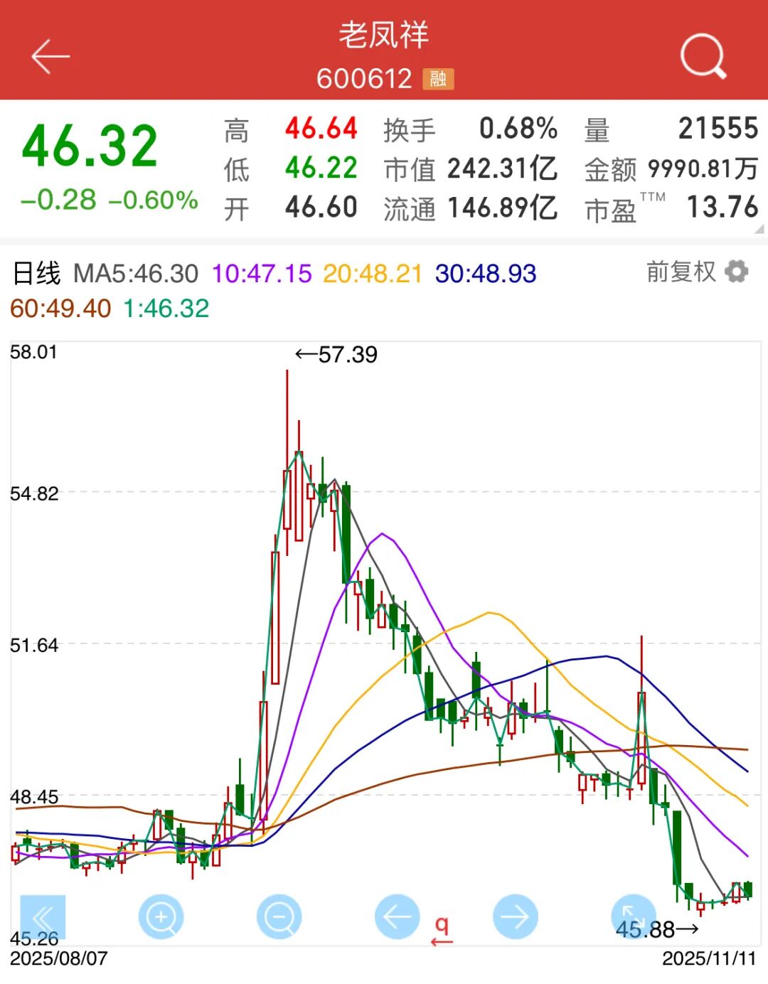 最近两个月,老凤祥股价持续下跌,截至今日收盘,报46.32元,距离9月上旬下跌19%。