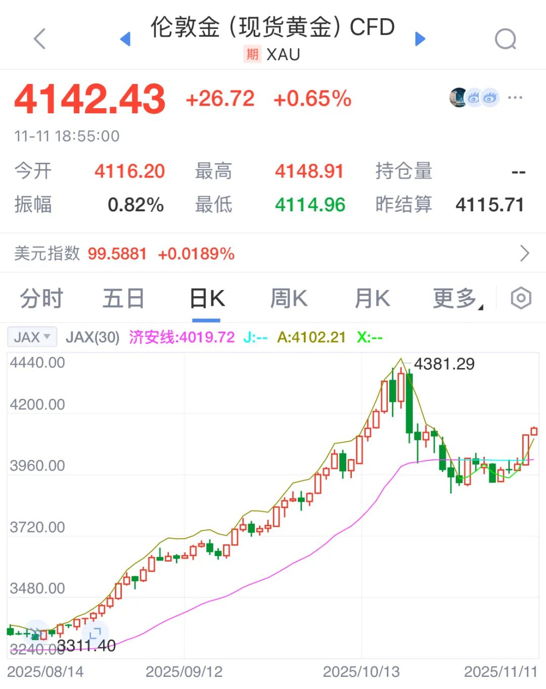 截至11日,现货黄金走出“三连涨”,连续收复4000美元/盎司、4100美元/盎司重要整数关口。