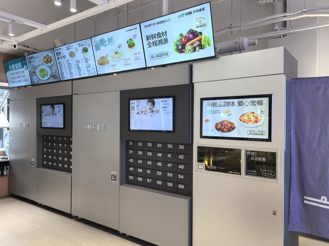 走进店内,首先注意到的,一定是正对大门的两台类似外卖柜的“大家伙”。这就是整个智慧食堂的“超级大厨”——AI星厨智能化设备。