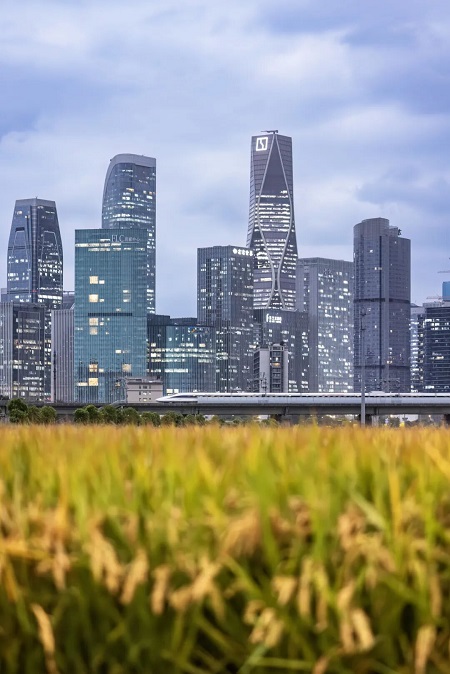 The rice fields go viral online for their perfect match with the passing high-speed train and skyscrapers. [Photo/WeChat account: qjshijicheng]
