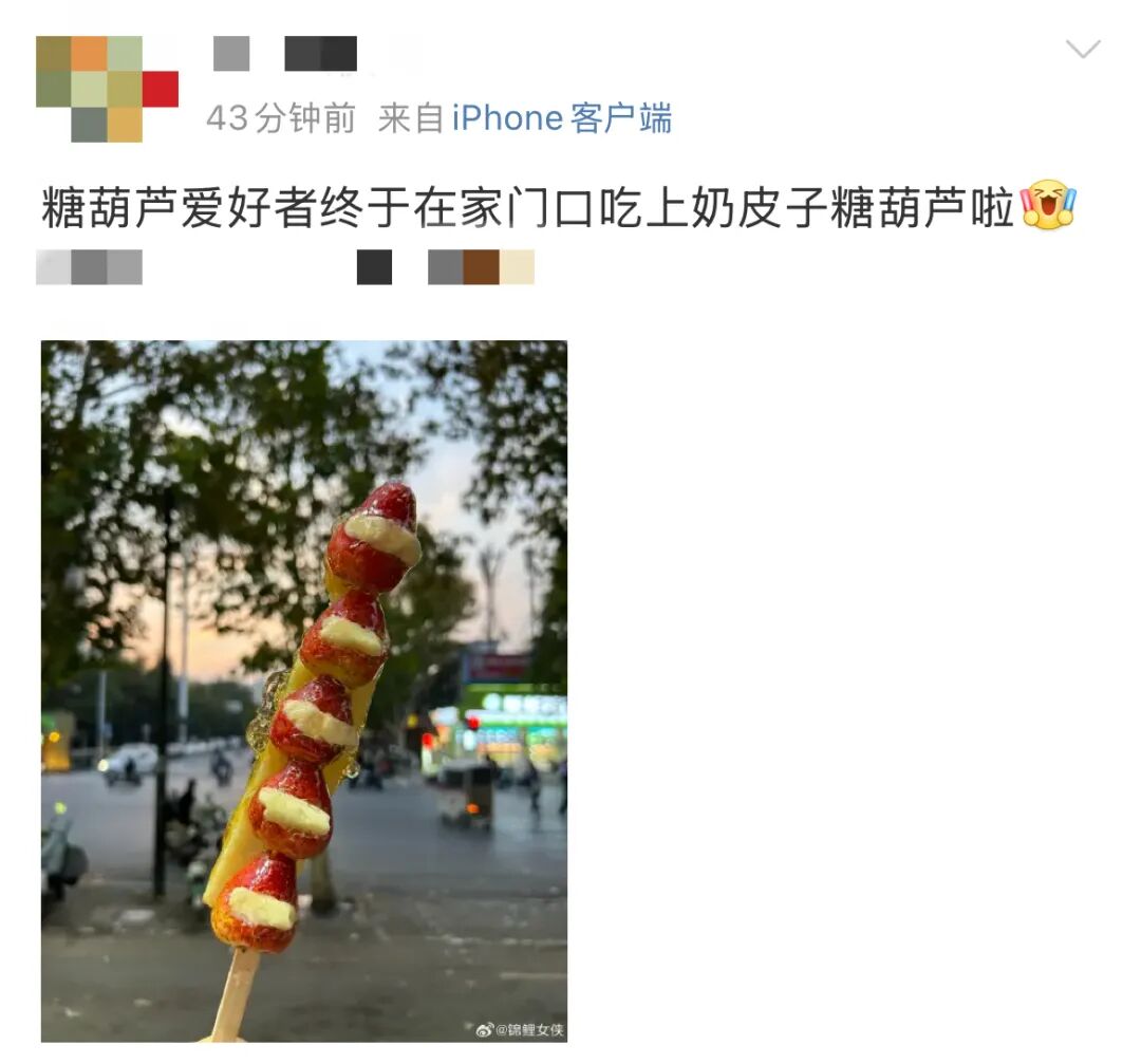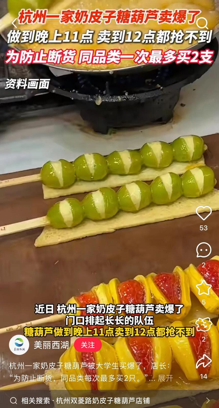 在杭州,一家奶皮子糖葫芦卖爆了,到晚上12点都抢不到。为了防指断货,同品类每次最多买两支。
