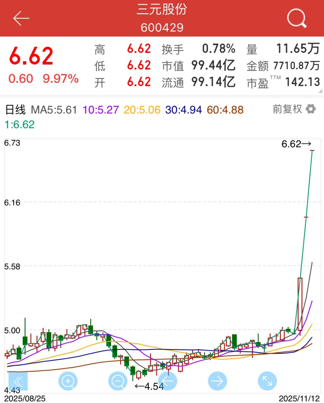 奶皮子糖葫芦的爆火,也在资本市场引发连锁反应。今天(11月12日), 北京区域乳企三元股份开盘后就一字封死涨停板,截至收盘股价报6.62元/股,走出三涨停。