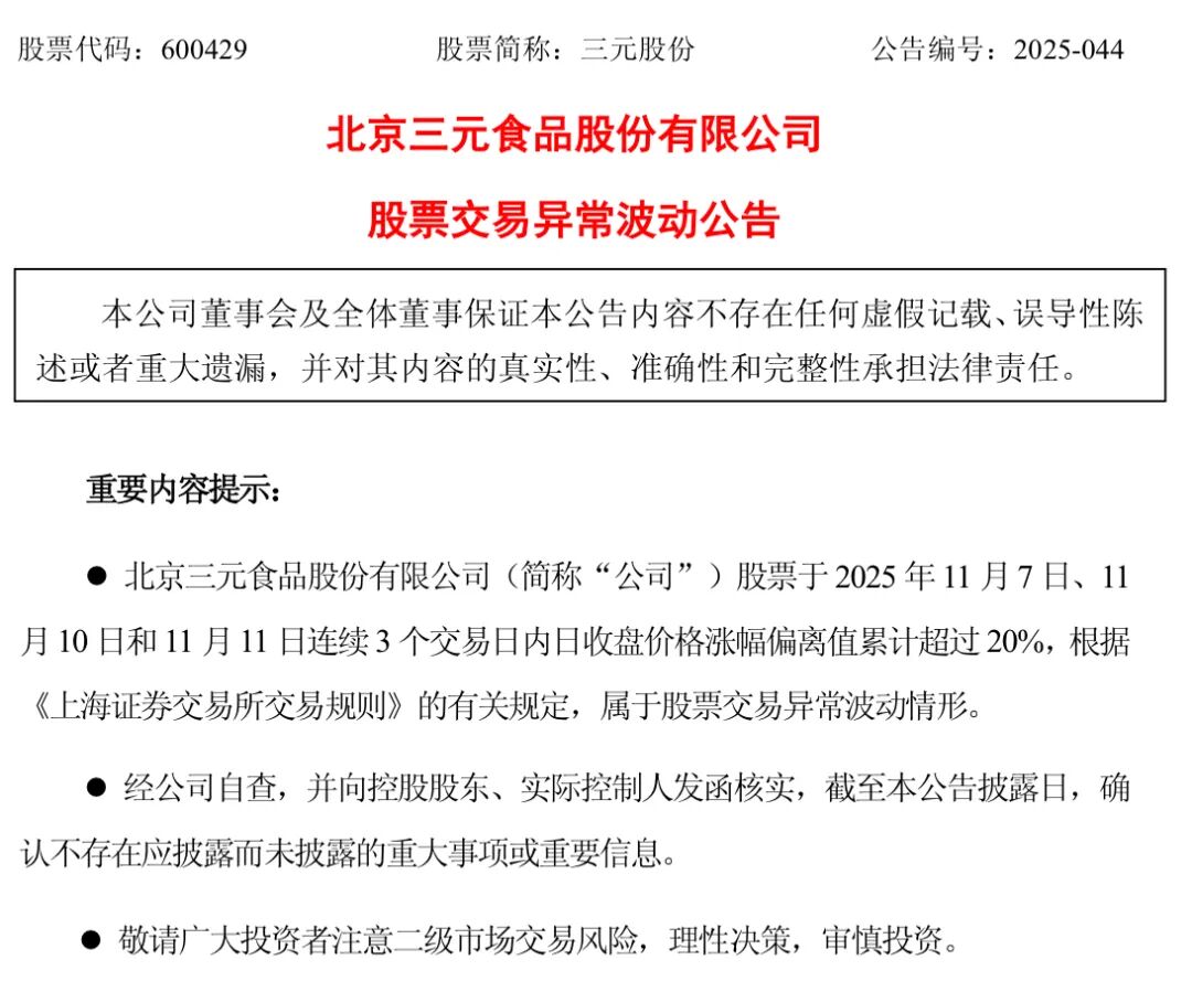 在11月11日晚的公告中,三元股份称,公司不存在应披露而未披露的重大事项或重要信息,也未发现对公司股票交易价格可能产生重大影响的媒体报道、市场传闻、热点概念或重大事件。请投资者注意二级市场交易风险,理性决策,谨慎投资。