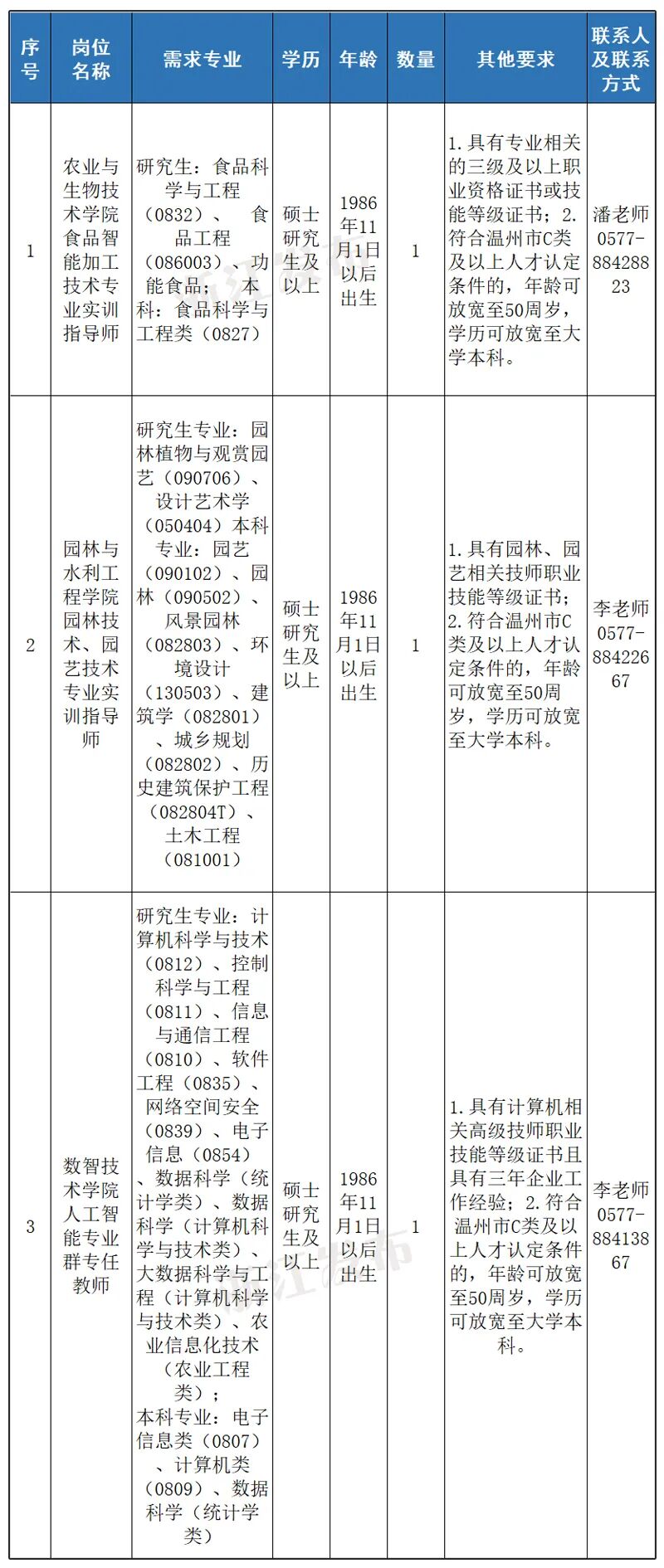报名网址:应聘人员登录学校人才招聘网站(https://zp.wzvcst.edu.cn,此报名系统为本次招聘唯一报名平台)并注册个人真实信息后,选择岗位进行报名,必须上传的材料包括身份证、二寸免冠电子照片、各层次学历学位证书,国内高校毕业生还需提供学信网各层次学历认证,留学人员还应提供教育部中国留学服务中心出具的国(境)外学历学位认证书(含大学本科和研究生);其他根据岗位条件及报名表内容提供相应的佐证材料。凡材料不全或无效者,资格初审不予通过。每位应聘人员限报1个岗位。