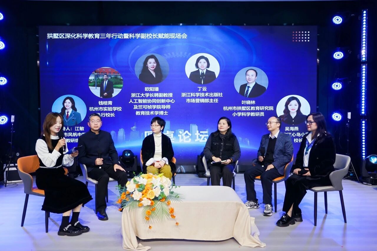 在成果展示环节,省教科院附小、卖鱼桥小学、观成实验学校通过TED演讲分享了科学教育实践案例。江心岛小学数智非遗馆与AI未来中心同步开馆,并举行《慧智赋能:面向未来的新范式》新书发布仪式。在随后的赋能论坛中,科学副校长、教师及教研员代表围绕“人工智能如何激活中小学科学教育动能”展开深度对话,为拱墅科学教育未来发展提供专业指引。