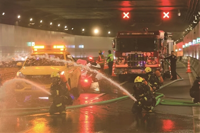 更危急的是,事故车辆在处置中突然冒烟起火。霎时间,隧道内警铃大作,风机全力运转排烟,雨喷淋系统精准对准火源。隧道外,交警、消防、120急救、隧道应急班组等多路力量闻令而动,无缝衔接,充分展现了多部门联动的雷霆效率。