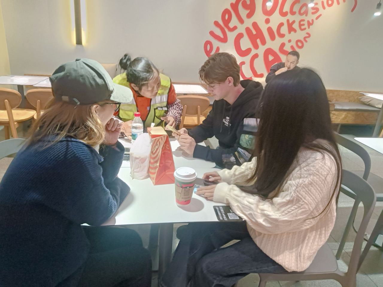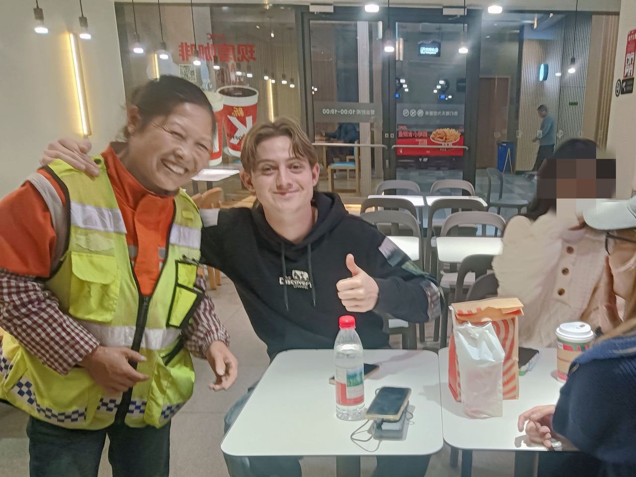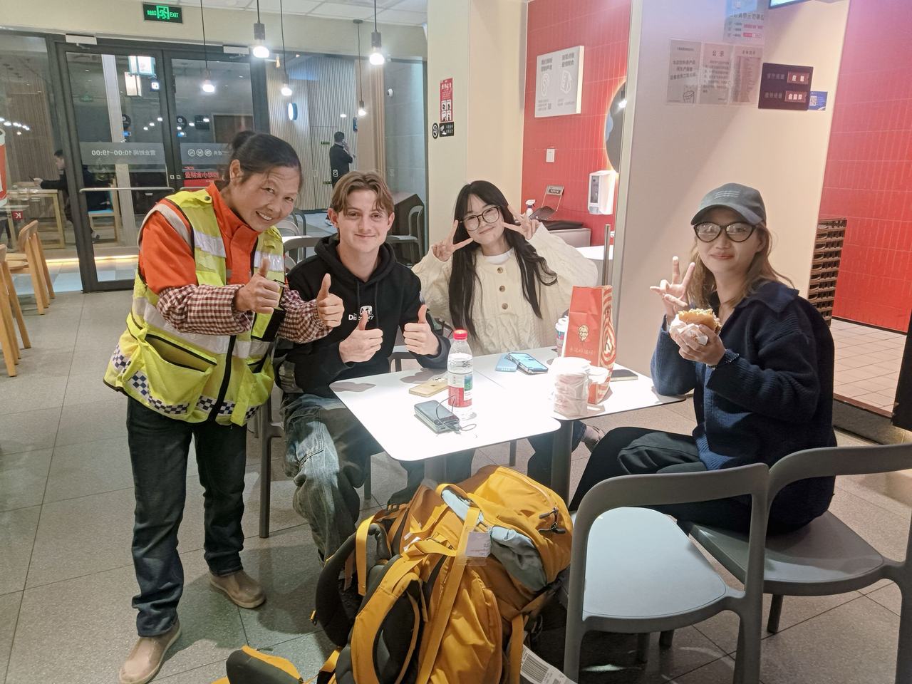 “我是荷兰人,这次从上海出发,本来想一路搭车看中国的风景,结果送我的人到这儿就走了,我不知道该怎么继续往前走。”小伙语速急促地说着,蔡叶飞耐心倾听,时不时点头回应,还拿出手机帮他查看后续路线。两人全程用英语基本无障碍交流的场景,很快吸引了不少途经顾客的目光——有人停下脚步拿出手机拍摄,有人小声议论“没想到保洁阿姨会讲英语”,惊讶与赞叹的目光纷纷投向这位身着保洁服的普通工作人员。