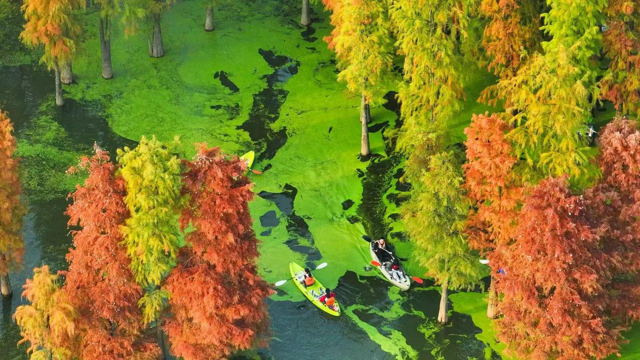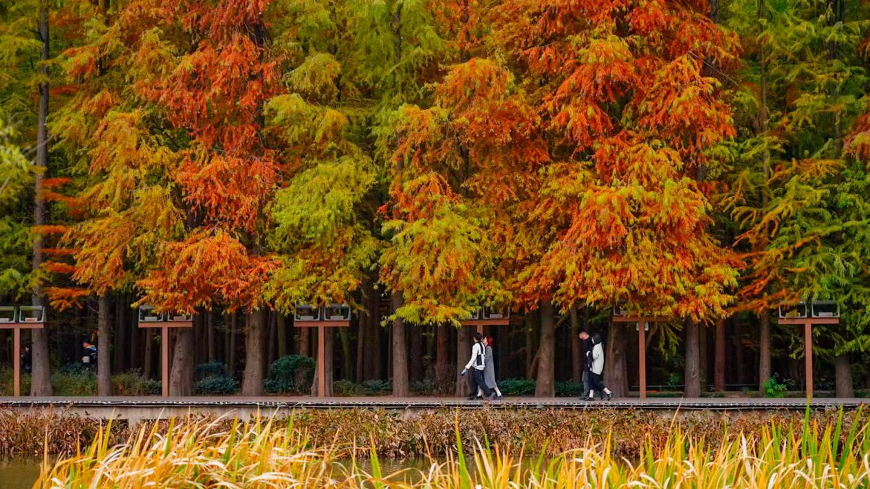 这条备受期待的接驳专线,聚焦地铁青山湖站D口至青山湖水上森林之间1公里的核心景观带。没有城市喧嚣的打扰,车轮驶过之处,澄澈湖水始终相伴,阳光洒在湖面形成的细碎波光与岸边树影交织,微风拂过便化作流动的光影星河,随手就能定格满目的温柔。作为季节限定的“颜值担当”,岸边水杉林在秋冬时节换上三色盛装,红的热烈、黄的明媚、绿的清新,倒映在湖水中宛如大自然亲手绘制的油画,每一段路程都满是治愈感。