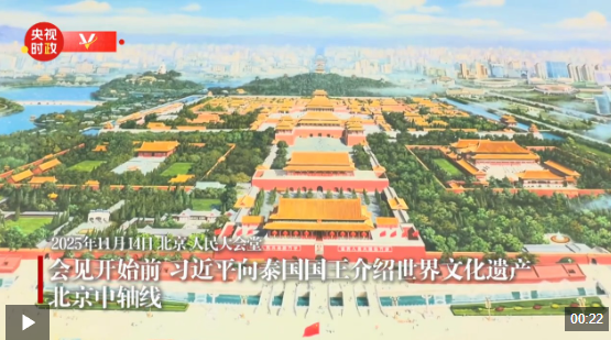 会见开始前,习近平向泰国国王介绍世界文化遗产——北京中轴线。
