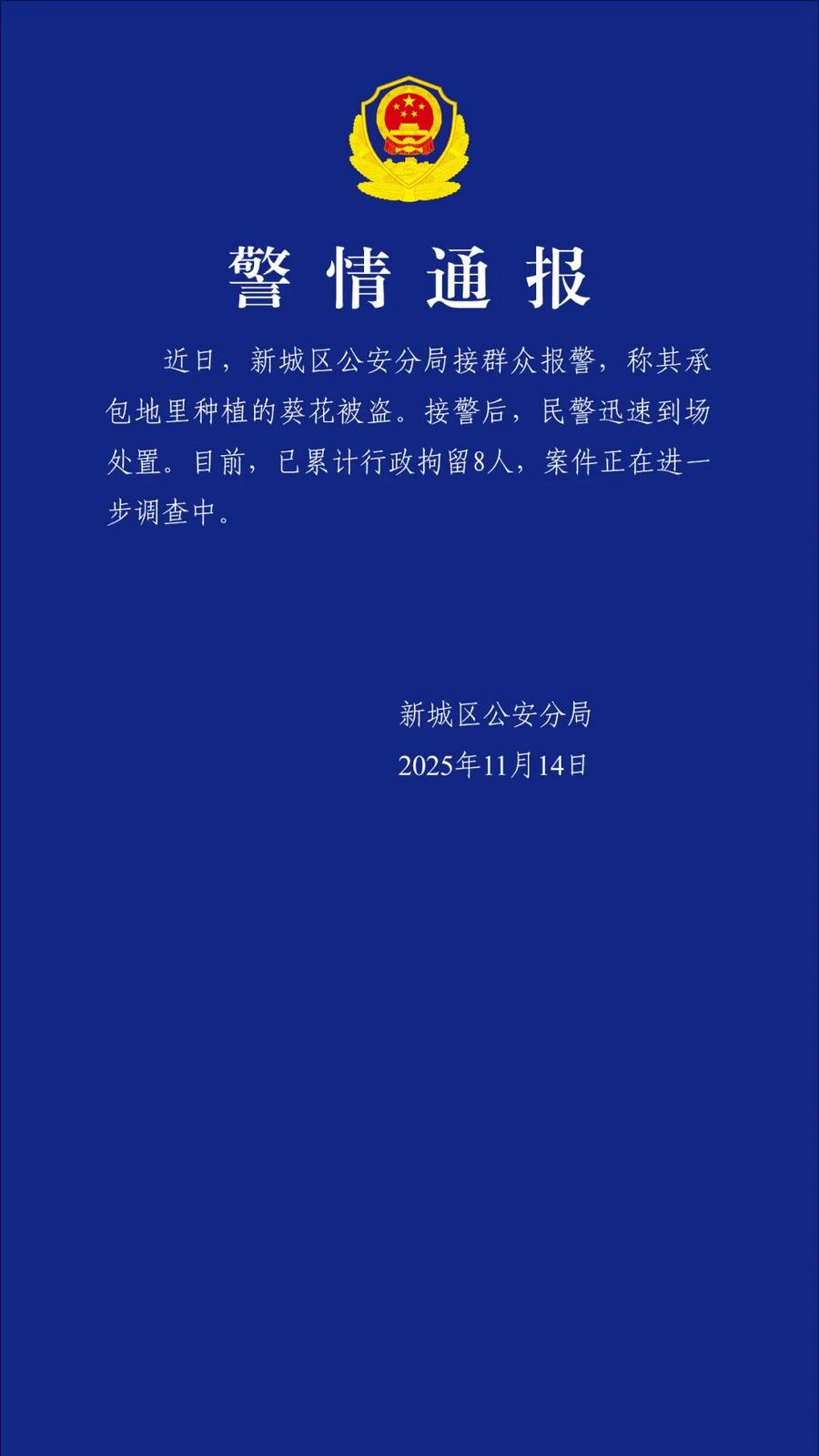 央视网消息:11月14日,呼和浩特市新城区公安分局发布警情通报,近日,新城区公安分局接群众报警,称其承包地里种植的葵花被盗。接警后,民警迅速到场处置。目前,已累计行政拘留8人,案件正在进一步调查中。