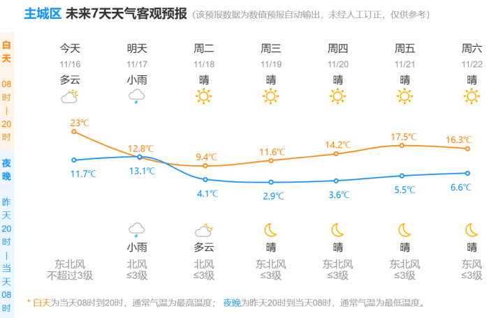 杭州市气象台2025年11月16日15时50分发布主城区寒潮蓝色预警信号:受寒潮影响,17到18日杭州市本级所有街道有一次强降温、大风和弱降水过程,预计日平均气温过程降温幅度可达8到11℃,19到20日早晨最低气温平原地区1到4℃,有霜或霜冻,山区0到-2℃,有薄冰,17日最大偏北风平原地区5到7级,山区和湖面7到9级,请注意做好防寒保暖和防风工作。