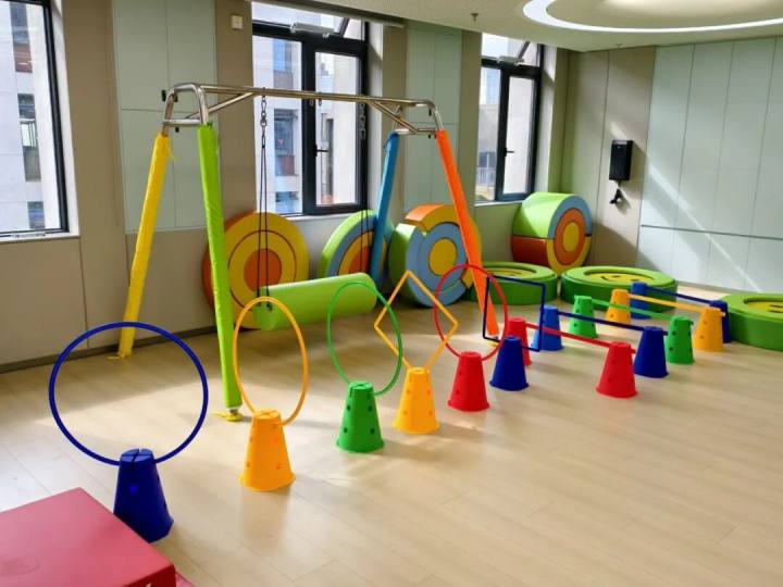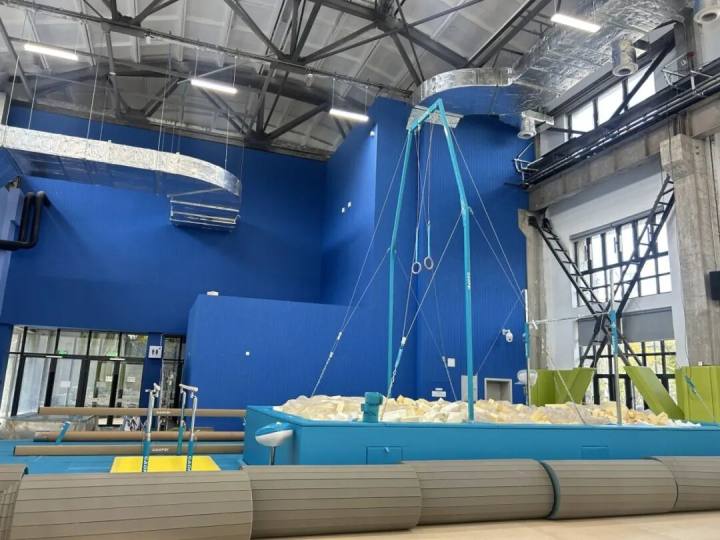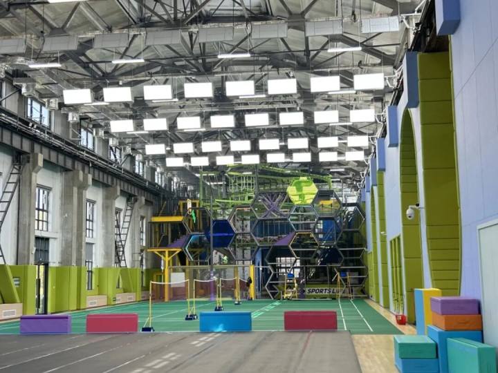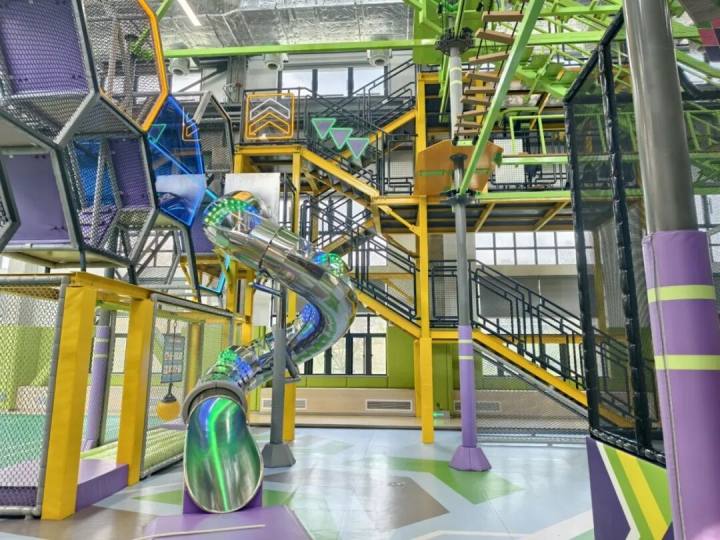 因为面积、层高等条件都足够,这里开设了艺术体操课程,可以实现跑跳和抛接等动作。顺着这块场地往前看,是四片羽毛球场。视线的尽头是一片荧光色“蜂窝”结构的场所,这是儿童运动馆,占地800平方米。结合孩子们的兴趣、运动素养需求等,设置了攀岩、儿童体适能、蹦床、高空滑索、轮滑等课程。