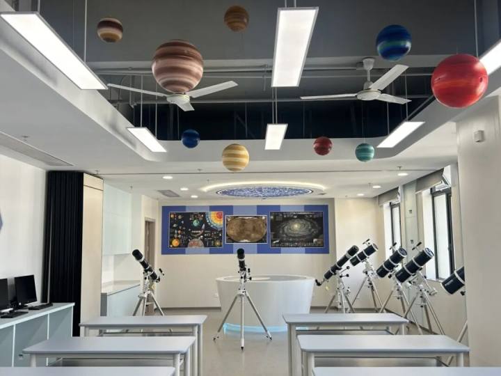 刚走过粉色走廊,又来到蓝色教室。这间天文教室特别炫酷,摆着十几架望远镜。
