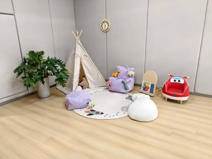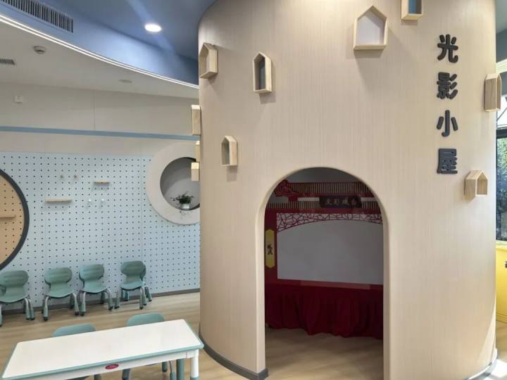 教室里面更好玩,中间有个“光影小屋”,孩子们可以在里面操作皮影戏,探索光影。空间设计充满细节,设有情绪安抚室,还配备了幼儿专用卫生间与婴儿尿布台,非常贴心。