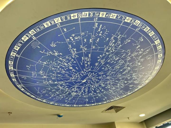 教室后面有座圆形星台,孩子们可以看到杭州某月某日某时能观察到哪些星座。顶上还有一幅我国古代常用的星图,上下对比,可以看到古今差异。