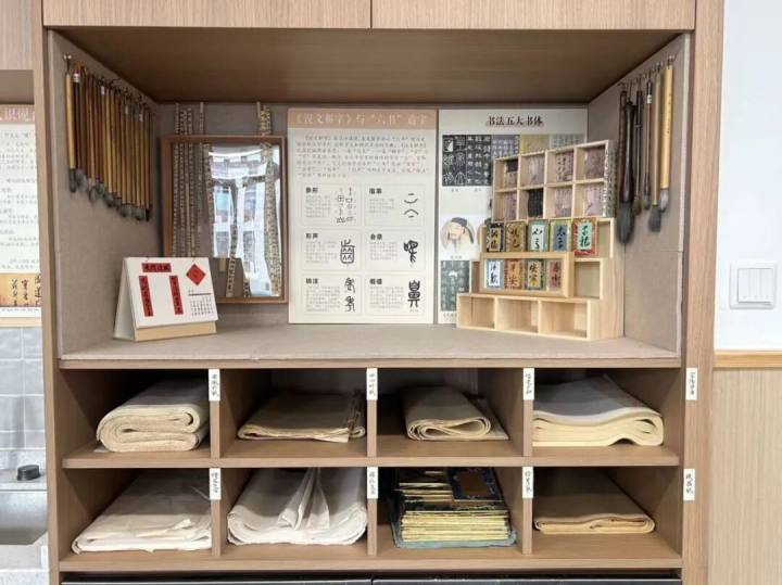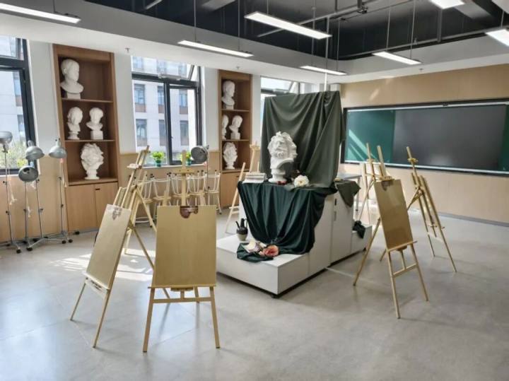 书法教室布置得古色古香,储物架上挂上十几支毛笔,摆好了七八种纸。素描教室里有十几个石膏像,画板也已经摆放好。
