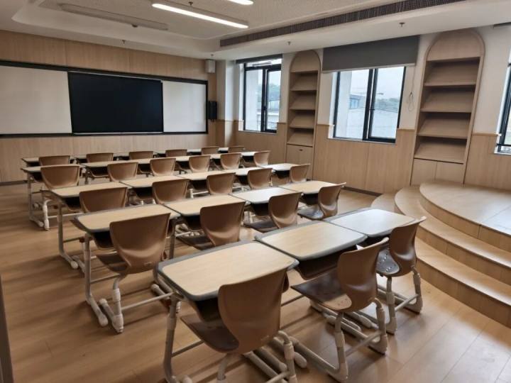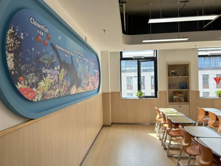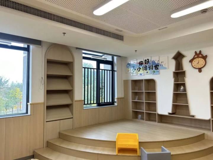 在3号楼里,记者走进几间教室,一看就很有辨识度,墙上装着大书架,挂上了“你好,小小阅读家”的牌子。最特别的一点是,教室一角有个三层台阶走上去的舞台。