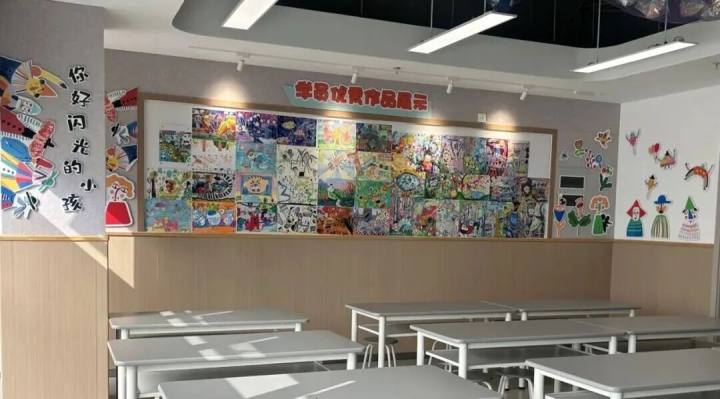 他带着我们走进一间较小的教室,后面整面墙都铺着毛毡板,贴上同学们的画作,他说:“这主要是用来展示学生作品的。教室可以容纳12-20人,是精致小班,半山分中心开出三间小教室,满足家长们对于儿童美术精品班的需求。”