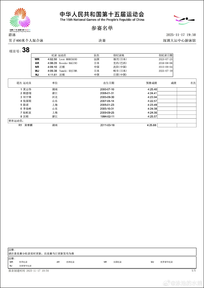 此外,全运会男子400米个人混合泳预赛,汪顺4:25.57排名第九。根据官网秩序册,因浙江队赵梁州该项目弃权,汪顺递补进入决赛。