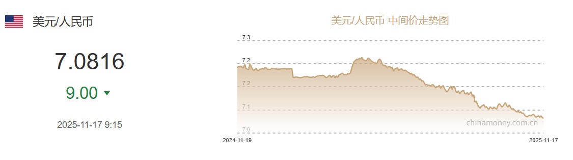 中新网11月17日电 据中国外汇交易中心网站消息, 中国人民银行授权中国外汇交易中心公布,2025年11月17日银行间外汇市场人民币汇率中间价为:1美元对人民币7.0816元,上调9个基点。