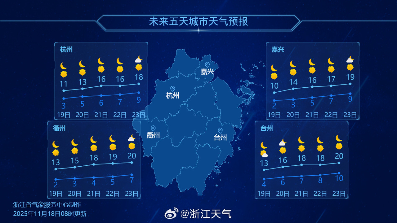 浙江部分城市天气预报。图源:浙江天气