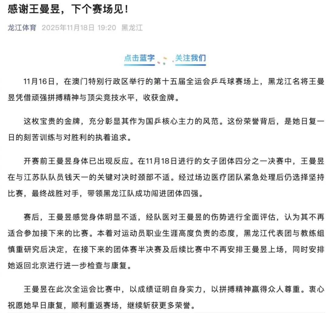 赛后,王曼昱感觉身体明显不适,经队医对王曼昱的伤势进行全面评估,认为其不再适合参加接下来的比赛。本着对运动员职业生涯高度负责的态度,黑龙江代表团与教练组慎重研究后决定,在接下来的团体赛半决赛及后续比赛中不再安排王曼昱上场,同时安排她返回北京进行进一步检查与康复。